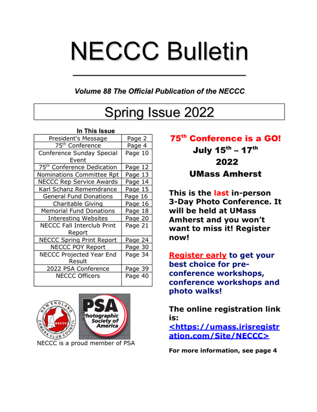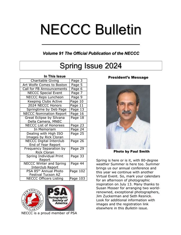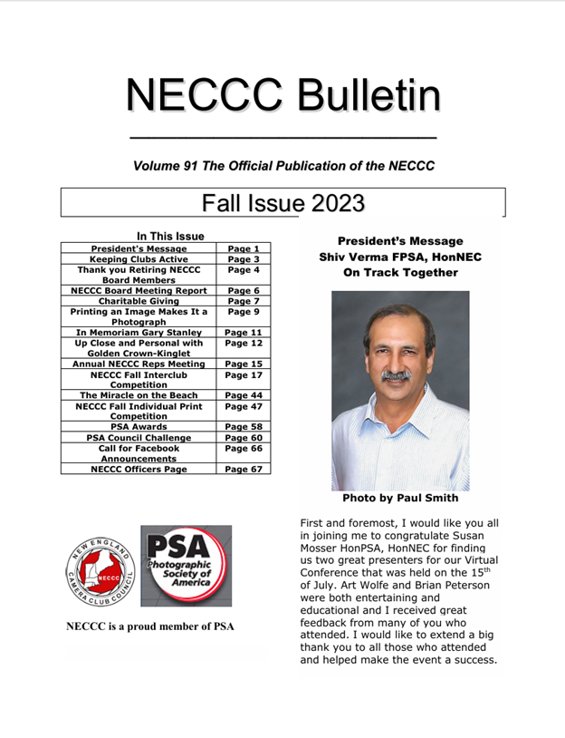 The award-winning Bulletin has been the official publication of NECCC for many years. Paul Smith, MNEC, has been our Bulletin editor since the Fall 2011 issue. The Bulletins are in PDF format.